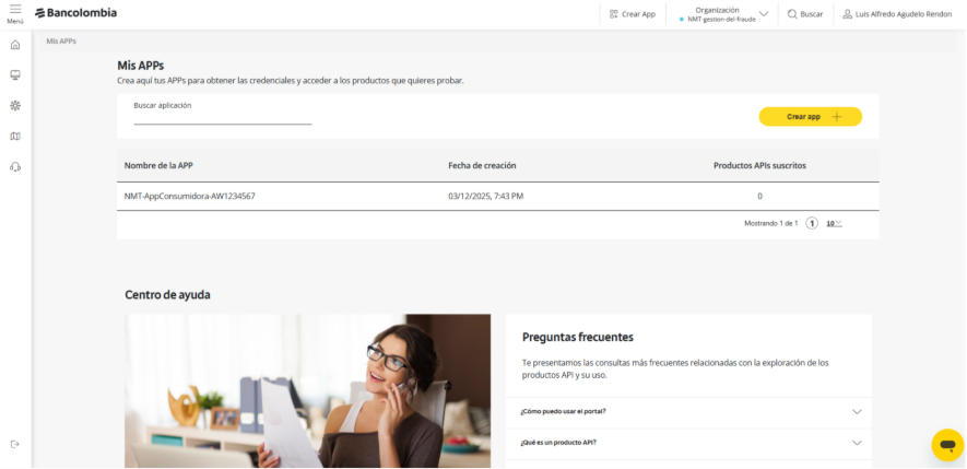 Se mostrarán las Apps asociadas a tu organización, su fecha de creación y a cuantos Productos de APIs está suscrita: