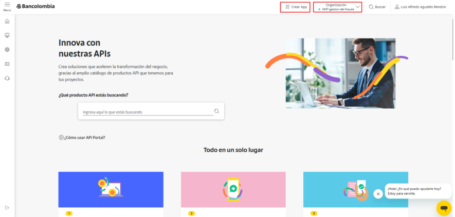 Al ingresar al portal en el menú superior has clic sobre el botón Crear App, te abrirá una vista con un formulario que te permitirá crear una aplicación en la organización activa: